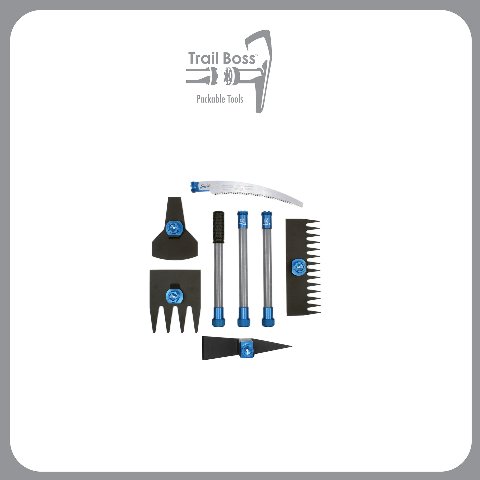 Packable tools facilitate trail construction and maintenance in difficult to reach places, with one multi-segment handle and multiple detachable heads that conveniently fit in a backpack.